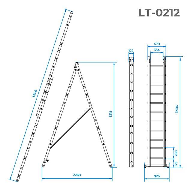 Конструкція дозволяє використовувати її як стрем’янку або як приставні сходи, а в складеному вигляді має невеликі габарити для зберігання. За допомогою ременів та замків безпеки, ви легко зможете встановити сходи у необхідному вам положенні. Функціональність драбини може бути розширена за допомогою додаткової сходинки-полиці LT-6000.