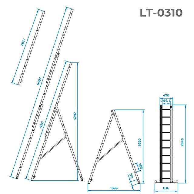 Алюмінієві сходи LT-0310 виготовлені з надміцного, легкого, стійкого до корозії алюмінієвого профілю. Вони стійкі та не ковзають по будь-яких поверхнях завдяки надійним пластиковим ніжкам, що також захищають меблі й підлогу від вм'ятин та подряпин. Рифлені сходинки не дадуть нозі зісковзнути під час роботи. Модель розрахована на тривалий строк експлуатації та відповідає європейському стандарту якості EN 131.