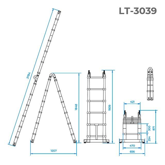Алюмінієві сходи LT-3039 виготовлені з надміцного, легкого, стійкого до корозії алюмінієвого профілю. Діаметр алюмінієвої труби сходів досягає 89 мм, а максимальне навантаження становить 150 кг. Сходи стійкі та не ковзають по будь-яких поверхнях завдяки надійним пластиковим ніжкам, що також захищають меблі й підлогу від вм'ятин та подряпин. Рифлені сходинки не дадуть нозі зіслизнути під час роботи. Модель розрахована на тривалий строк експлуатації та відповідає європейському стандарту якості EN 131