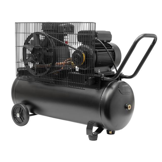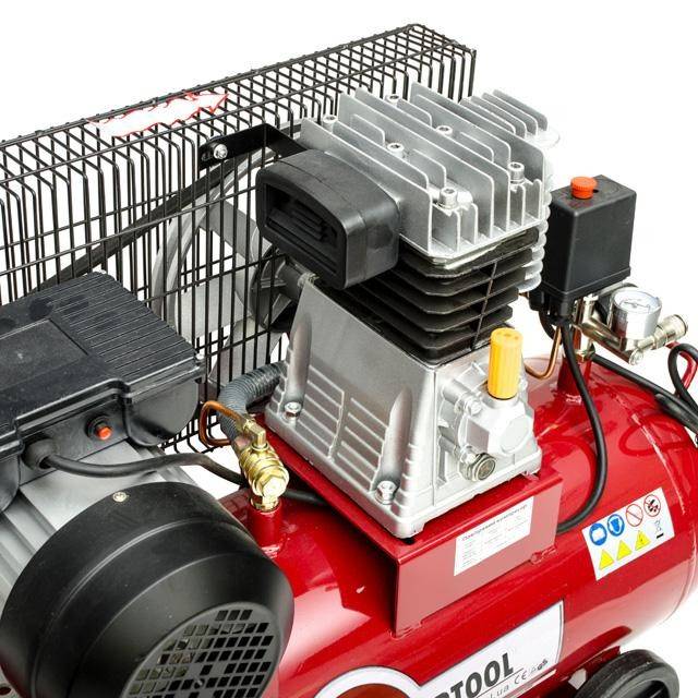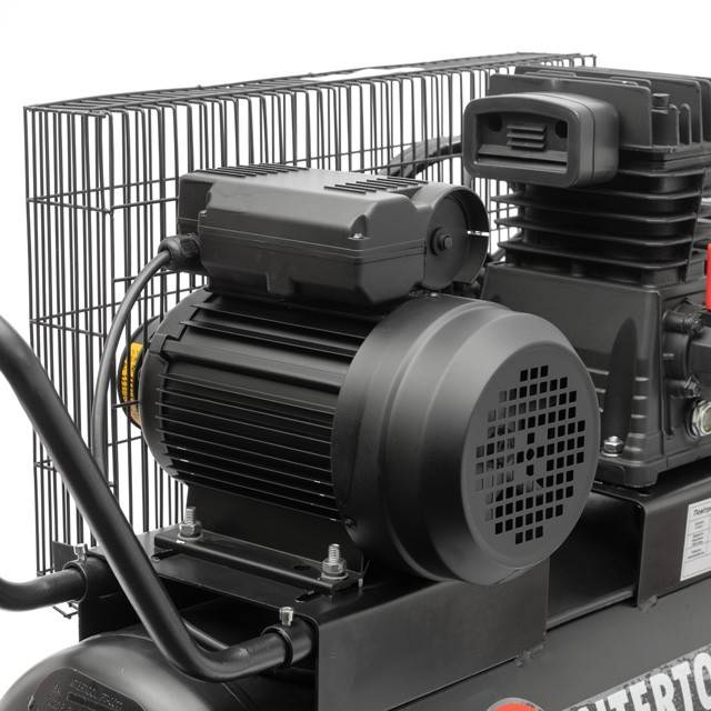 Компресор має ремінний привід від електродвигуна до головки з двома сталевими циліндрами. Це забезпечує ефективне охолодження й зменшує навантаження на двигун. Мідна обмотка двигуна збільшує ресурс служби, підвищує міцність та продуктивність компресора, що підтверджує 3 роки гарантії.