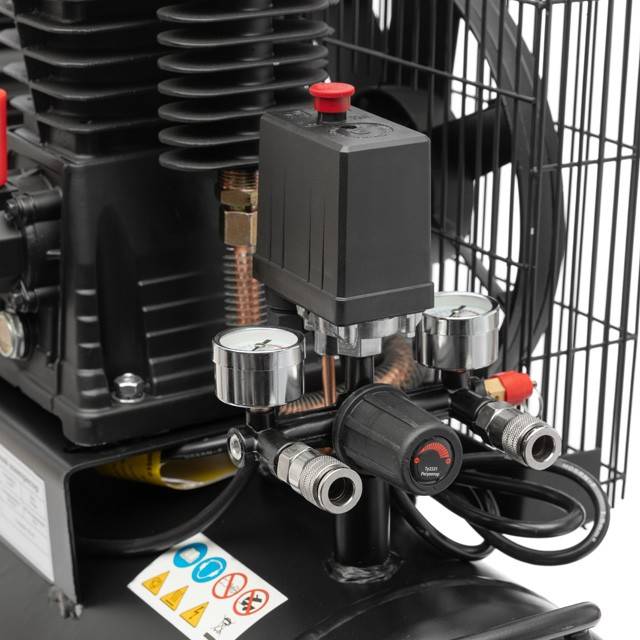 Зручне транспортування компресора на робочому майданчику здійснюється двома колесами та за допомогою ручки. Опорні ніжки компресора виготовлені з гуми, вона згладжує вібрацію та виступає в ролі елемента, що амортизує. Для того, щоб можна було контролювати тиск у ресивері й тиск на виході, компресор оснащений двома манометрами з регулятором вихідного тиску. Регулятор тиску з манометром дозволяє регулювати та постійно підтримувати вихідний тиск, необхідний вашому інструменту або обладнанню.