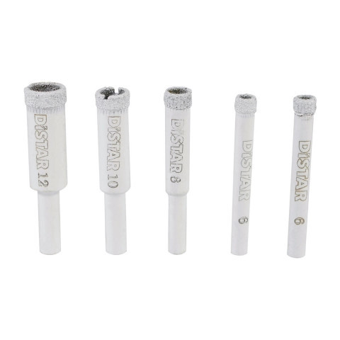 Набір складається з п`яти алмазних свердл з хвостовиком D – 10мм діаметрами 6, 8, 10,12 мм, довжиною 50 мм та висотою робочого алмазного слою 5 мм.