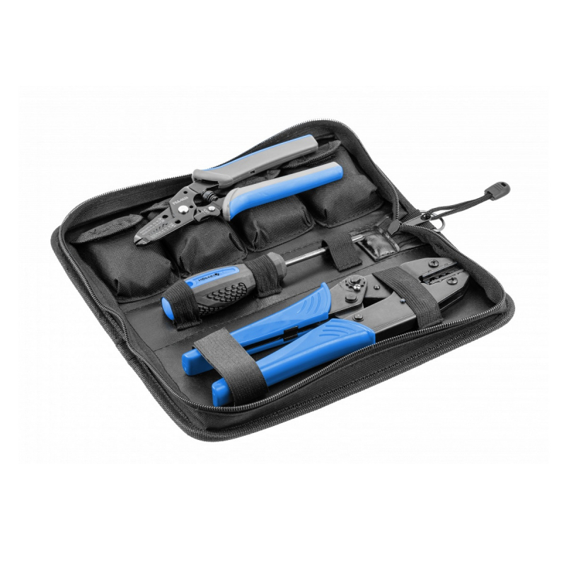 Універсальний набір кліщів для обтиску електричних сполучних затискачів з 5 змінними матрицями, що дозволяють працювати з багатьма поширеними типами електричних затискачів. Система швидкої зміни матриць дозволяє ефективно змінювати матриці в залежності від типу обтисканого сполучного затискача. Крім того, щипці, що входять до комплекту, для видалення ізоляції з проводів разом з різаком забезпечують всі необхідні інструменти для виконання роботи, упаковані в один зручний футляр. Використовуються при монтажних та складальних роботах у сфері електронних послуг, в автомеханіці та телекомунікаціях.