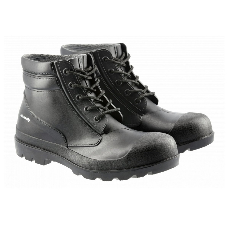 Чоловічі захисні черевики / чоботи класу безпеки S5 згідно з ISO 20345:2011. Взуття оснащене сталевим підноском, що захищає пальці ніг, і сталевою вставкою, що проколює, в підошві, що дозволяє працювати на землі з гострими виступаючими предметами. Завдяки підошві, що не ковзає, взуття ідеально підходить для ходьби по нерівних і слизьких поверхнях. З іншого боку, антистатичні властивості гарантують безпечне використання взуття як у сухому, так і у вологому середовищі. Взуття рекомендоване в промисловій, логістичній, транспортній та будівельній галузях. Ідеально підходить для зовнішніх робіт.