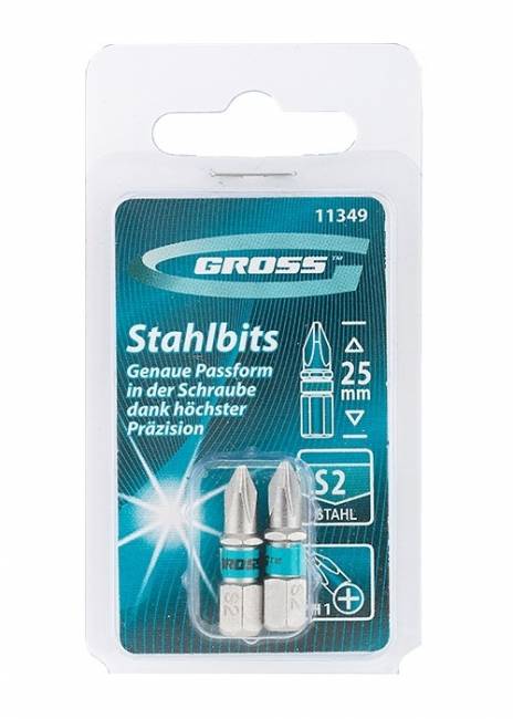 Біти застосовуються як насадки для ручного та механічного інструменту. Основу біти складає шестигранний хвостовик розміром 0,6 см (1/4 дюйма)_x000D__x000D_Довжина біти 25 мм, тип шліцю - PH1 (хрестоподібний). Як захист від контрафакту на кожному біті є кольорове кільце з логотипом торгової марки GROSS. Набір із десяти біт упакований у жорстку термоформовану плівкову коробку розміром 95 Х 50 мм.