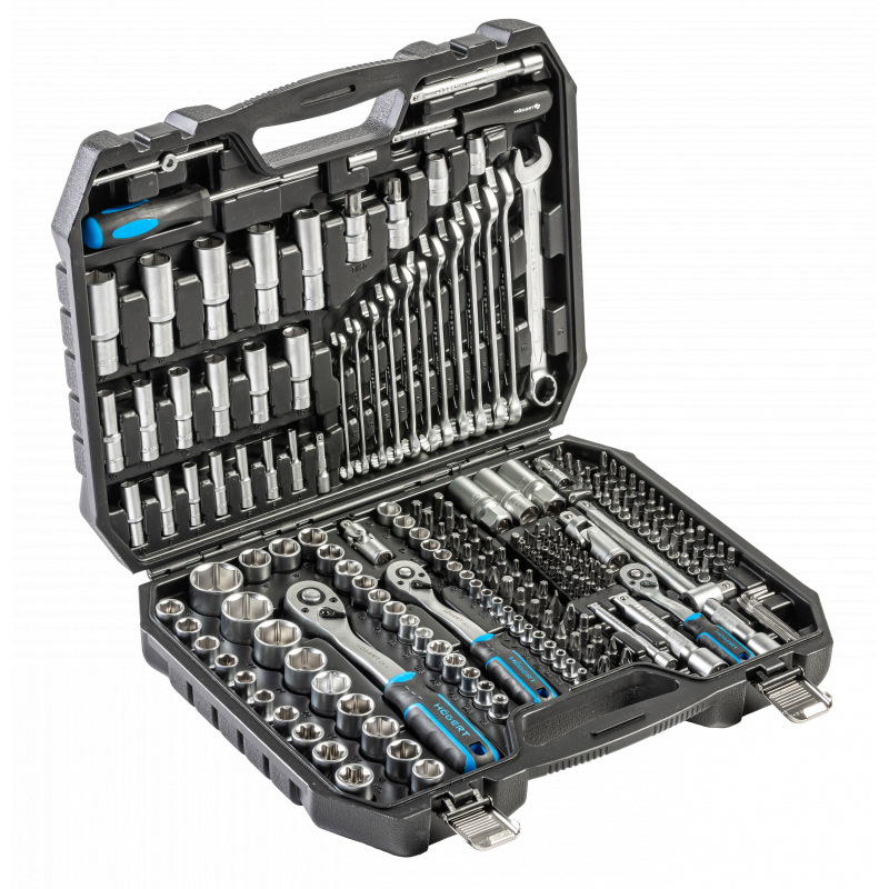 Головки та біти виготовлені з високоякісної легованої сталі CrV стійкі до деформації, штамповане кування храповий механізм тріскачки (72 зуби) виготовлено з високоякісної легованої сталі CrMo, призначеної для роботи при високих навантаженнях практичний кейс з металевими петлями та замками