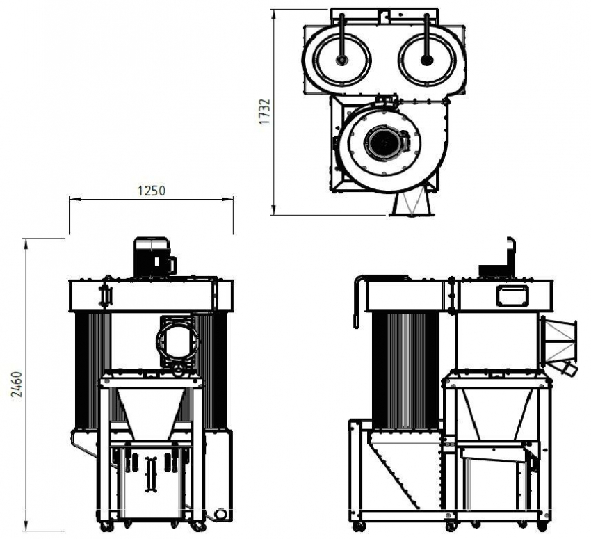Розташований знизу металевий контейнер на колесах для збору великої фракції відходів від циклону, герметично фіксується до аспірації двома притискними важелями. Всі відходи, за винятком найдрібнішої фракції, потрапляють саме в цей контейнер, решта фільтрується двома фільтрами і пил збирається в нижньому поліетиленовому мішку. Завдяки великій робочій поверхні фільтрів та високому ступеню попереднього відцентрового очищення, фільтри мало забруднюється, що дає стабільно-високу інтенсивність всмоктування від обладнання, навіть при роботі зі шліфувальними верстатами.