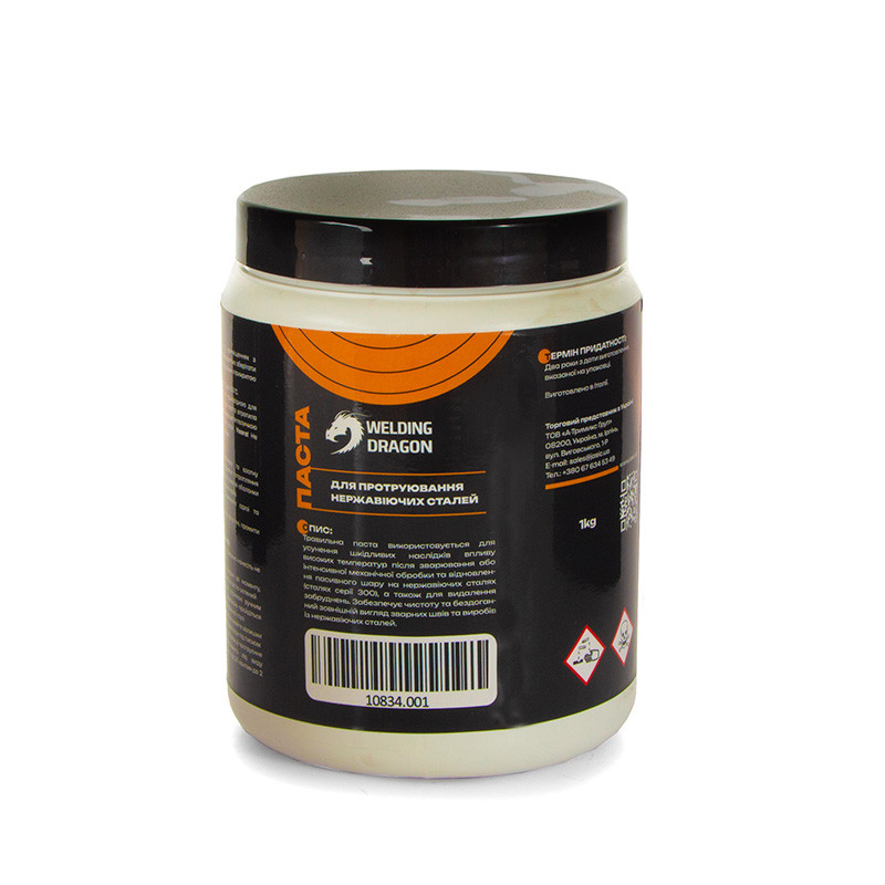 Травильна паста Welding Dragon використовується для протруювання поверхонь з великою кількістю зварних швів. Видаляє іржу та соляні (кислотні) нальоти, термічну зміну кольору, окалини з поверхонь зварних конструкцій. Очищає та вирівнює поверхню, робить її однорідною та матовою. Після обробки не залишає кислотних та сольових залишків.