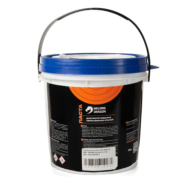 Травильна паста Welding Dragon використовується для протруювання поверхонь з великою кількістю зварних швів. Видаляє іржу та соляні (кислотні) нальоти, термічну зміну кольору, окалини з поверхонь зварних конструкцій. Очищає та вирівнює поверхню, робить її однорідною та матовою. Після обробки не залишає кислотних та сольових залишків. Спосіб застосування: очистити поверхню від бруду (олія, фарба тощо) привести пасту до однорідного стану за допомогою палички з пластику або нержавіючої сталі (палички з заліза не використовувати) рівномірно нанести засіб тонким шаром залишити для протруювання допоки колір пасти не змінить свій колір на світло-зелений для швів після ручного дугового зварювання додатково пройтись по поверхні щіткою з нержавіючої сталі по завершенню змити струменем води під тиском Час протруювання залежить від матеріалу та температури навколишнього середовища і коливається від 20 хвилин до 2 годин. Зверніть увагу, травильна паста це токсичний засіб, тому слід дотирмуватись наступних умов: температура зберігання від +2 до 35°C у сухому та добре вентильованому приміщенні. Травильна паста Welding Dragon представлена вагою 1 кг та 3 кг.