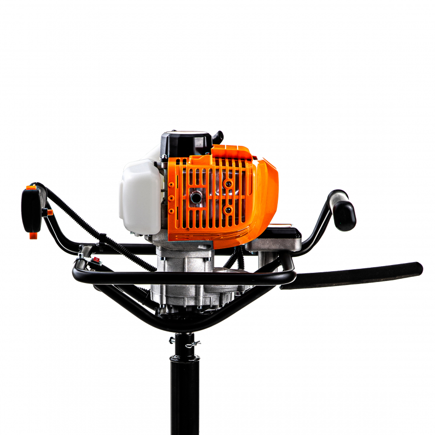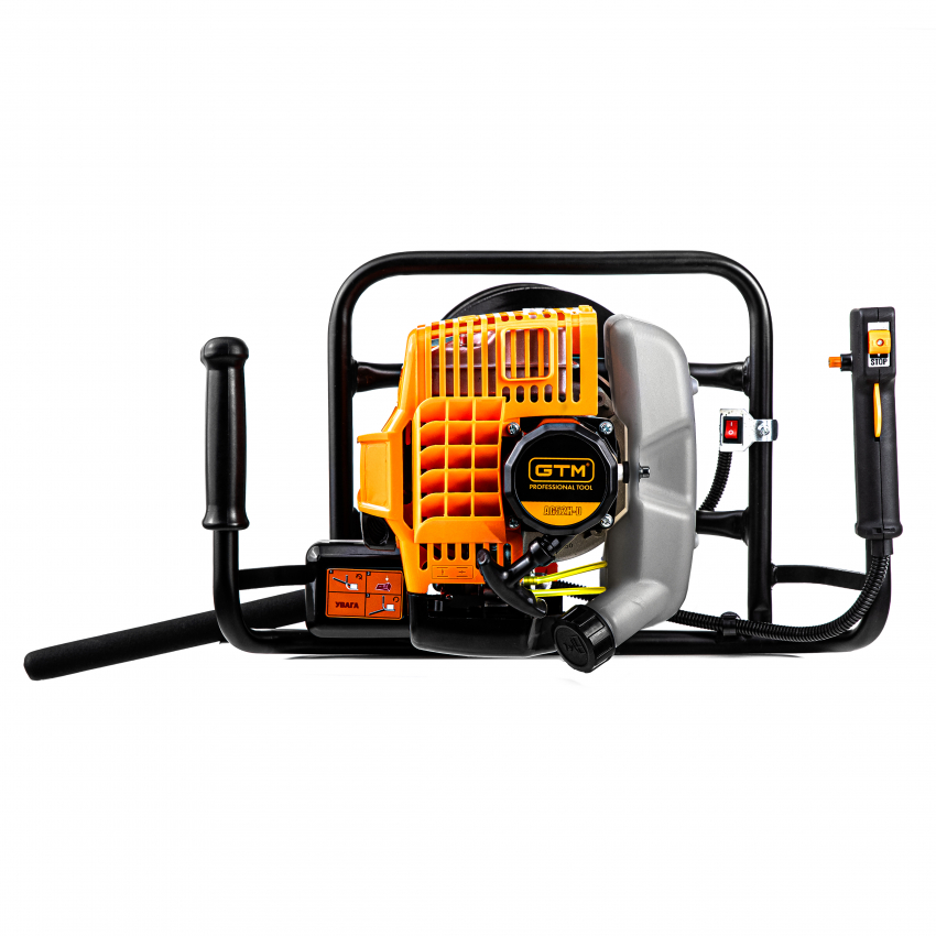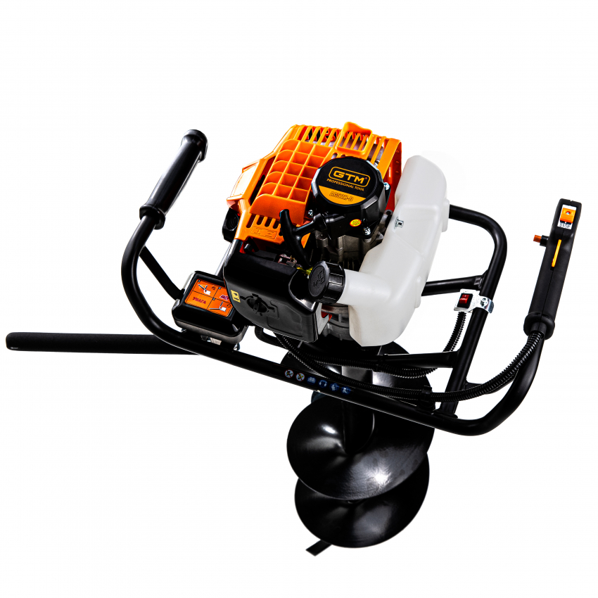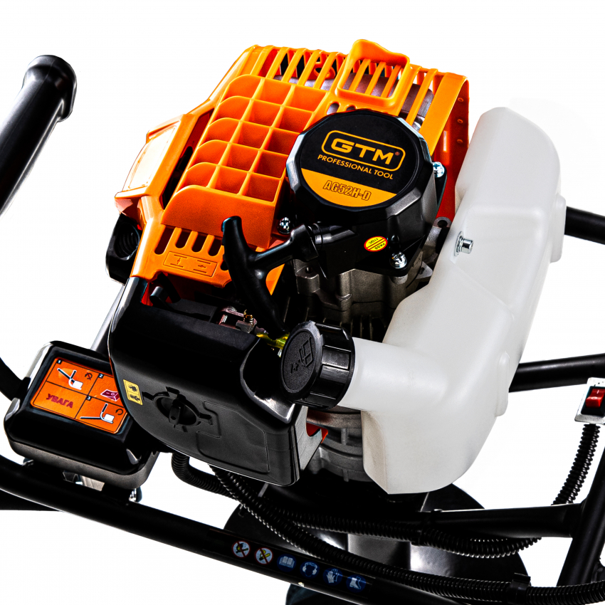 GTM AG52H-D - мотобур напівпрофесійного класу, призначений для буріння отворів у ґрунті або в льоду. Може застосовуватися при встановленні стовпів, монтажі фундаменту, садівництві. Інструмент обладнаний 2-тактним бензиновим двигуном з потужністю 1,46 кВт (2 к.с.) з підвищеним крутним моментом і збільшеним ресурсом роботи. Як паливо використовується суміш бензину з моторним мастилом у пропорції 40:1 (на 1 л бензину 25 мл мастила).