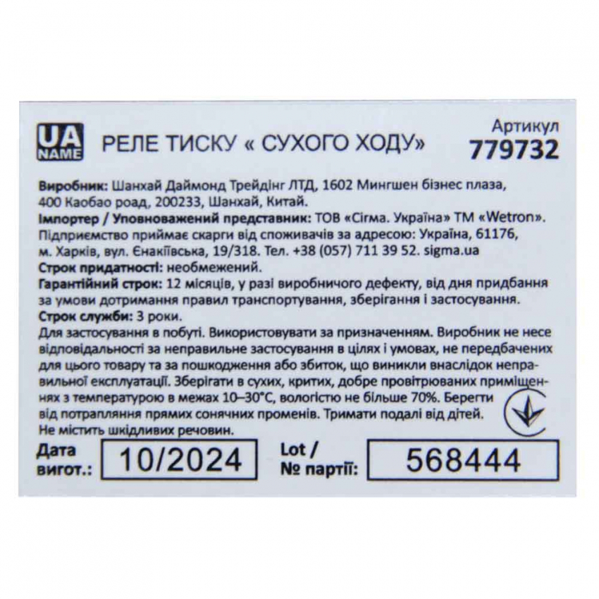 Реле тиску сухого ходу 1.5кВт 1.4-2.8 бар прямокут (гайка) WETRON (779732) дозволяє підтримувати постійний тиск у водопровідній системі. Допомагає знизити споживання електроенергії та води, забезпечує захист насосів від зайвої роботи і передчасного виходу з ладу.