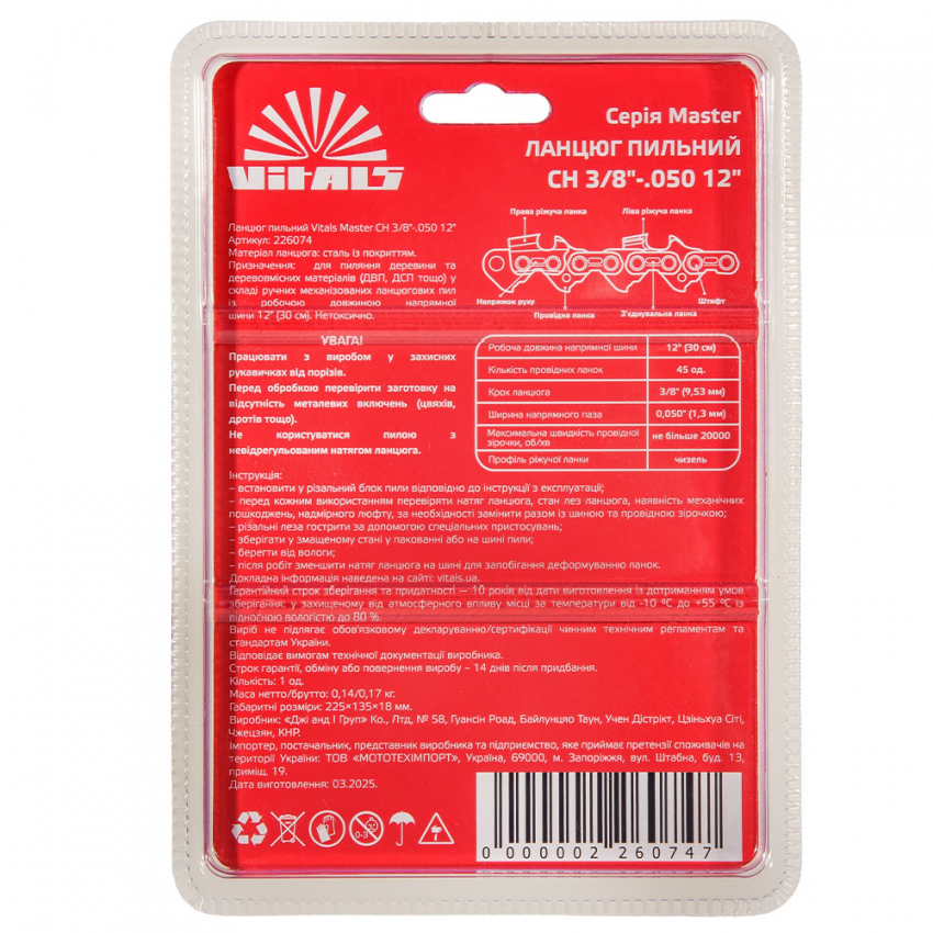 Завдяки точній геометрії ріжучих зубців та відмінному балансу, пильний ланцюг Vitals Master СH 3/8'-.050 12' забезпечує акуратний, швидкий та чистий різ, без зайвого навантаження на двигун ланцюгової пилки і руки користувача та забезпечує стабільну роботу навіть під час тривалих навантажень.