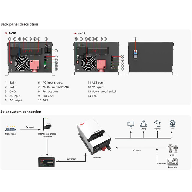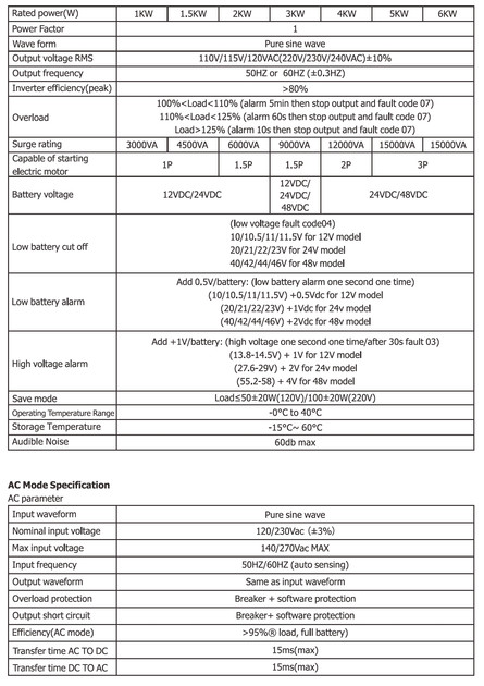 Серія EP3000 PLUS - це дуже економічний інвертор з чистою синусоїдою, з зарядним пристроєм змінного струму від 20А до 60А; пріоритет сонячної/змінної енергії налаштовується, при встановленні пріоритету сонячної енергії, сонячна енергія буде заряджати батареї в першу чергу, а змінна енергія також може заряджати батареї, коли струм сонячного зарядного пристрою занадто низький. Завдяки трансформатору з чистої міді, інвертор може працювати з усіма видами побутової техніки.