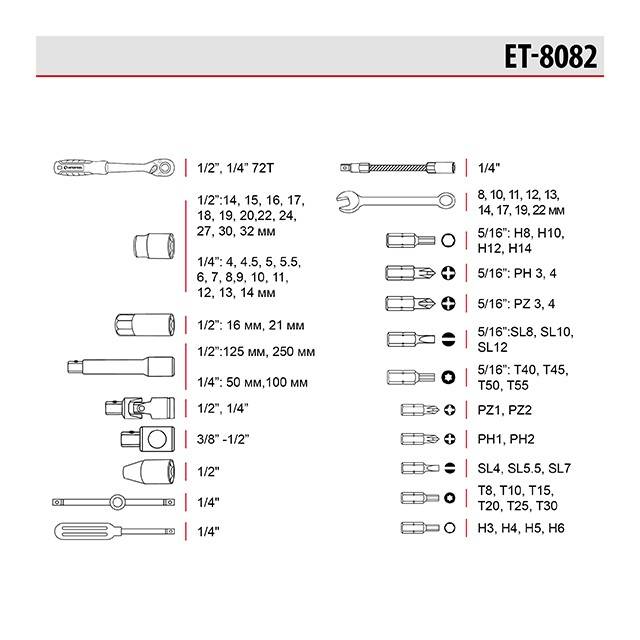 До набору увійшли всі необхідні інструменти для роботи з автомобілем, мототехнікою, велотехнікою та ін. Основою комплекту є дві тріскачки з посадковим квадратом 1/2' та 1/4', шестигранні головки, 9 ріжково-накидних ключів зі збалансованою ручкою, підходять для виконання різнопланових робіт на закручування та відкручування кріплень.