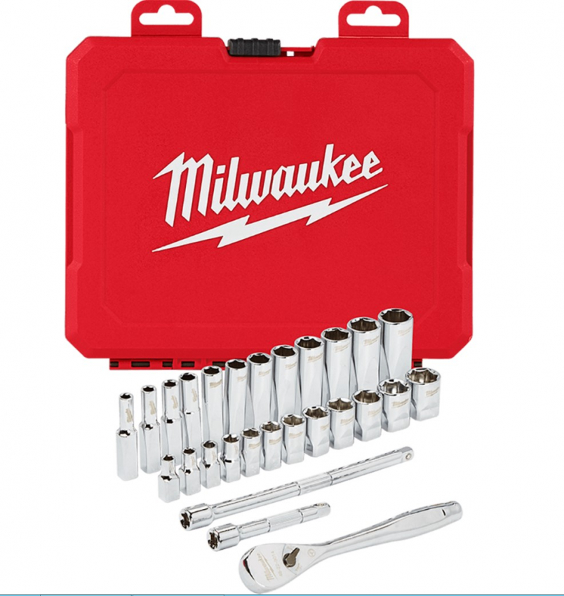 Набір головок торцевих хромованих 1/4'' MILWAUKEE, з тріскачкою та 2 подовжувачами, (28шт), пластиковий органайзер