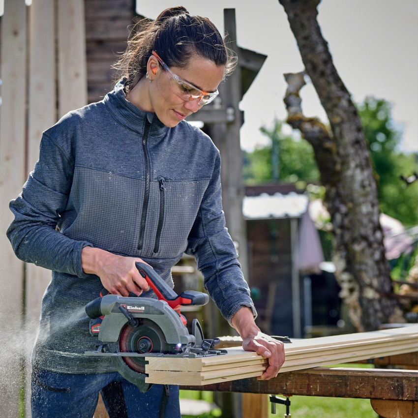 Інструмент серії Power X-Change Безщітковий двигун - більша потужність і довший строк експлуатації Зручна робота завдяки компактній конструкції Просте регулювання без інструментів (глибина різання, кут нахилу) Легка заміна диска завдяки блокуванню шпинделя Високоякісна підошва з алюмінію Поздовжній упор для точних розпилів Індикатор лінії розпилювання Вбудований світлодіодний ліхтар для освітлення робочої зони Адаптер для пилососа для чистого робочого місця Ергономічна ручка з функцією м'якої накладки Плавний пуск та гальмо електродвигуна захищають користувача та двигун Сумісна з напрямною шиною Einhell Сумісна з дисками діаметром отвору 16 мм та 20 мм Поставляється БЕЗ акумулятора і зарядного пристрою Акумуляторна ручна дискова пила Einhell Professional TP-CS 18/165 Li BL - Solo надзвичайно компактна та зручна, що забезпечує приємну роботу в майстерні та саду. Пила є пристроєм сімейства Einhell Power X-Change. Акумулятор і зарядний пристрій Power X-Change можуть використовуватися для всіх пристроїв сімейства Power X-Change. Інструмент живиться від безщіткового двигуна Einhell. Цей безщітковий двигун пропонує більшу потужність та довший час роботи, ніж звичайні двигуни з вугільними щітками. Пильний диск діаметром 165 мм з 24 зубцями дозволяє виконувати швидкі розпили глибиною 59 мм з регулюванням кута 90°. Регулювання кута виконується без інструментів, а пильний диск можна встановлювати, закріплювати та замінювати на 20-мм валу за допомогою блокування шпинделя. Безпека користувача та двигуна забезпечується плавним пуском та електродвигуновим гальмом. Різні допоміжні засоби для різання, такі як поздовжній упор, індикатор лінії різу та високоякісний стіл для розпилювання з алюмінію, завжди забезпечують точний розпил усіх видів деревини, таких як м'яка та тверда деревина, фанера або панелі з покриттям. Завдяки вбудованому світлодіоду робоча зона завжди освітлюється. Пилою зручно користуватись завдяки великій ручці з м'яким покриттям. Під час роботи вбудований адаптер для пилососа (для Ø 36 мм) завжди забезпечує чисте робоче місце, якщо підключено зовнішній пилосос. Акумуляторна дискова пила Einhell TP-CS 18/165 Li BL - Solo постачається з твердосплавним диском. Поставляється без акумулятора і зарядного пристрою, вони доступні окремо.