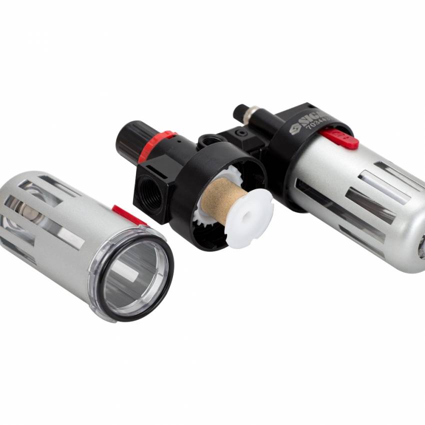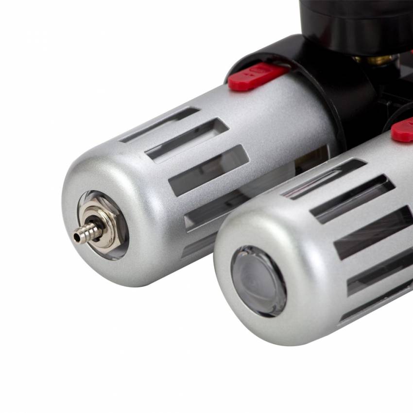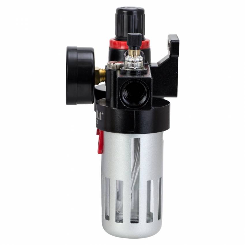 Блок підготовки повітря в зборі 1200л/хв Sigma 7034431 використовується для очищення стисненого повітря від твердих частинок, води, конденсату, масляної емульсії та інших домішок. Для регулювання контролю тиску стисненого повітря, а також підтримки його на необхідному рівні встановлено редуктор з манометром. Оснащений лубрикатором, завдяки якому здійснюється дозована подача олії до пневмоінструменту. Особливості: Максимальний робочий тиск: 10 бар; Максимальний допустимий тиск: 15 бар; Діапазон регулювання тиску: 0.5 – 8.5 бар; Об'єм колби для олії: 90 мл; Максимальна пропускна спроможність: 1200 л/хв. Переваги: Корпус виготовлений із сплаву на основі алюмінію; Колби для збору конденсату та змащувального матеріалу виготовлені з полікарбонату; Фільтруючий елемент із пористого сплаву на основі міді; Редуктор та манометр для регулювання тиску; Зручне регулювання подачі мастильного матеріалу; Клапан із автоматичним скиданням конденсату. Купити блок підготовки повітря Sigma Ви можете оформивши замовлення в нашому інтернет-магазині за допомогою простої форми, доставка здійснюється по всій Україні. Якщо у Вас виникли запитання, Ви можете зателефонувати за вказаними номерами або замовити зворотній дзвінок. Спеціалісти нашого інтернет-магазину нададуть Вам детальні консультації та допоможуть зробити правильний вибір.