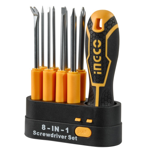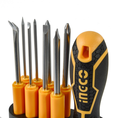 Викрутка зі змінними насадками 10 шт. INGCO призначена для монтажу/демонтажу різьбових з'єднань. Матеріал - високоякісна хромованадієва сталь. , 1 * 65, 2 * 65, міні лапи розміром 5 * 65, шила розміром 3 * 65. У комплекті універсальна ручка для змінних насадок (1 шт). Упакована в пластикову коробку.