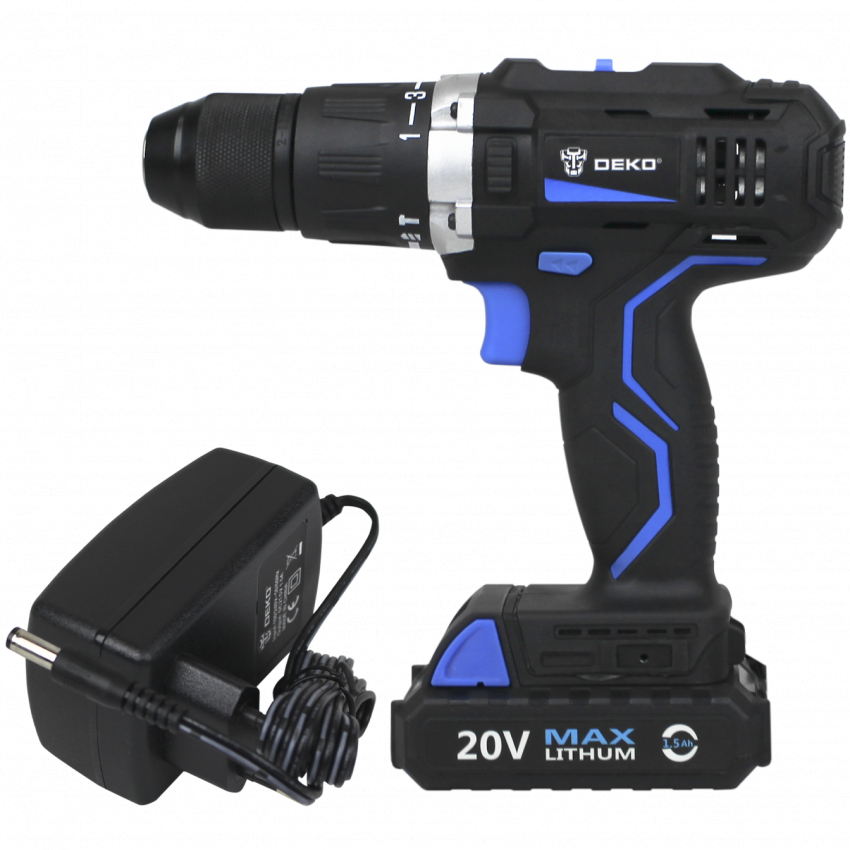 Акумуляторний дриль DEKO 20V MAX 1/2 дюйма з максимальним крутним моментом 58N.m. Існує функція удару. Подвійний діапазон швидкості та 15 + 2 положення зчеплення у компактному розмірі, який забезпечує точне управління для свердління в дерево, метал, пластик та всі завдання викрутки.
