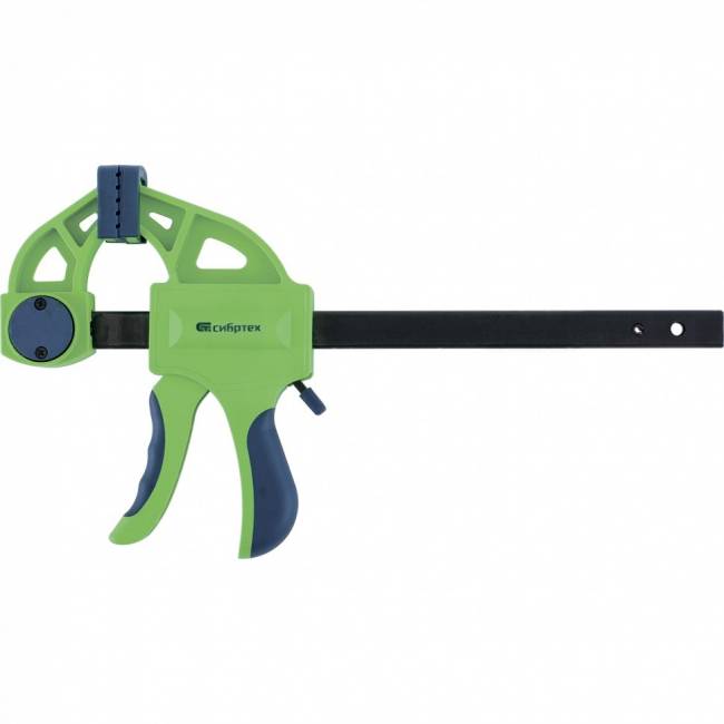 Струбцина виготовлена з ударостійкого пластику. Напрямна сталева. Робочі губки забезпечені накладками для запобігання пошкодженням предметів, що обробляються. Опорна губка переміщується і фіксується по всій довжині направляючої за допомогою рукоятки, а також може переставлятися на інший кінець напрямної, що дозволяє використовувати струбцину.