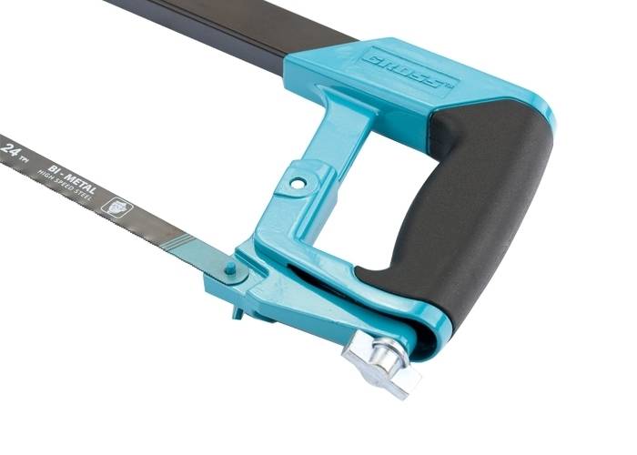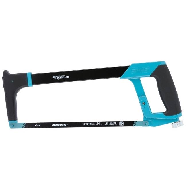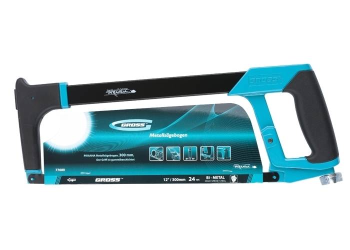 Ножівка по металу 'PIRANHA' торгової марки GROSS виготовлена із міцного алюмінієвого сплаву. Поверхня ножівки покрита додатковим шаром емалі, який захищає метал від довкілля. Обгумована рукоятка зручно і надійно фіксується в руці, тим самим підвищуючи ефективність інструменту в роботі. Важельно-гвинтовий механізм натягу полотна розташований безпосередньо під рукояткою. Зусилля, з яким можна зафіксувати полотно, становить 170 KGF, що дозволяє ефективно контролювати тиск полотна на заготівлю та забезпечує прямий, точний та рівний пропил. Ножівка комплектується біметалевим полотном. Довжина полотна 300 мм, крок зуба 24 TPI (24 зуби на дюйм, 1 дюйм = 2,54 см). Конструкція рамки ножівки дозволяє встановлювати полотно під кутом 45° і 90°.