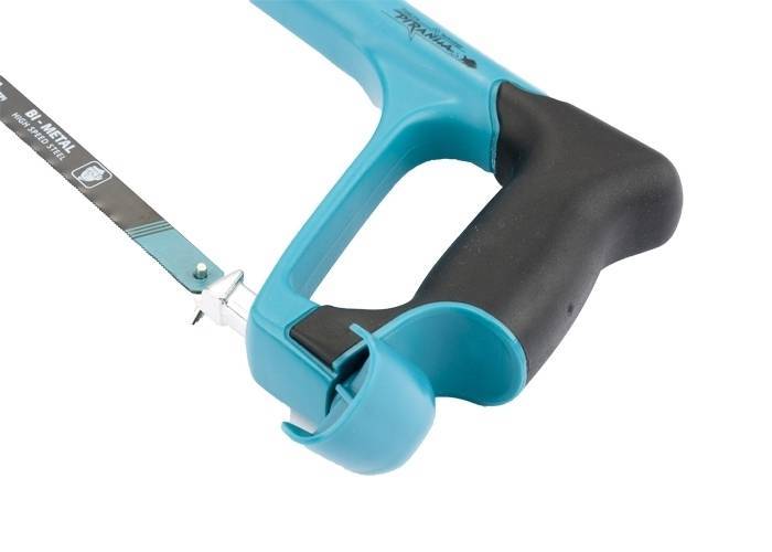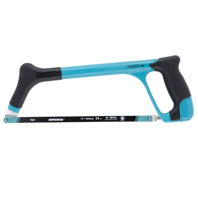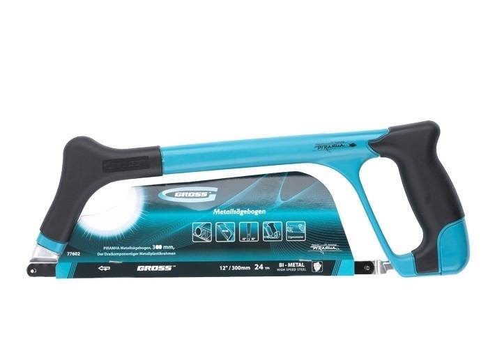 Ножівка по металу PIRANHA торгової марки GROSS призначена для проведення слюсарних робіт (різання профільного металу, труб та ін.). Трикомпонентна металопластикова рама із сталевим сердечником дозволяє встановлювати полотно під кутом 45° та 90°. Обгумована рукоятка зручно і надійно фіксується в руці, тим самим підвищуючи ефективність інструменту в роботі. Прихований у рукоятці гвинтовий механізм забезпечує оптимальне натягнення полотна (150 KGF/30000 PSI) для отримання прямого та акуратного пропилу. Ножівка комплектується біметалічним полотном із зубами із швидкорізальної сталі. Довжина полотна 300 мм, крок зуба 24 TPI (24 зуби на дюйм, 1 дюйм = 2,54 см).