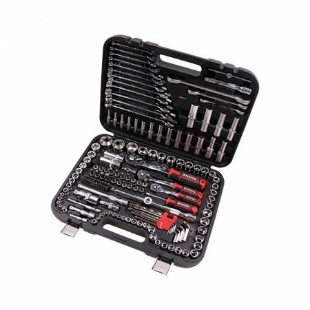 Набір зі 156 одиниць інструменту стане надійним помічником у вашій майстерні або гаражі. Основою набору є три тріскачки з посадковими квадратами 1/2', 3/8', 1/4', а також шестигранні головки розміром від 4 до 32 мм.